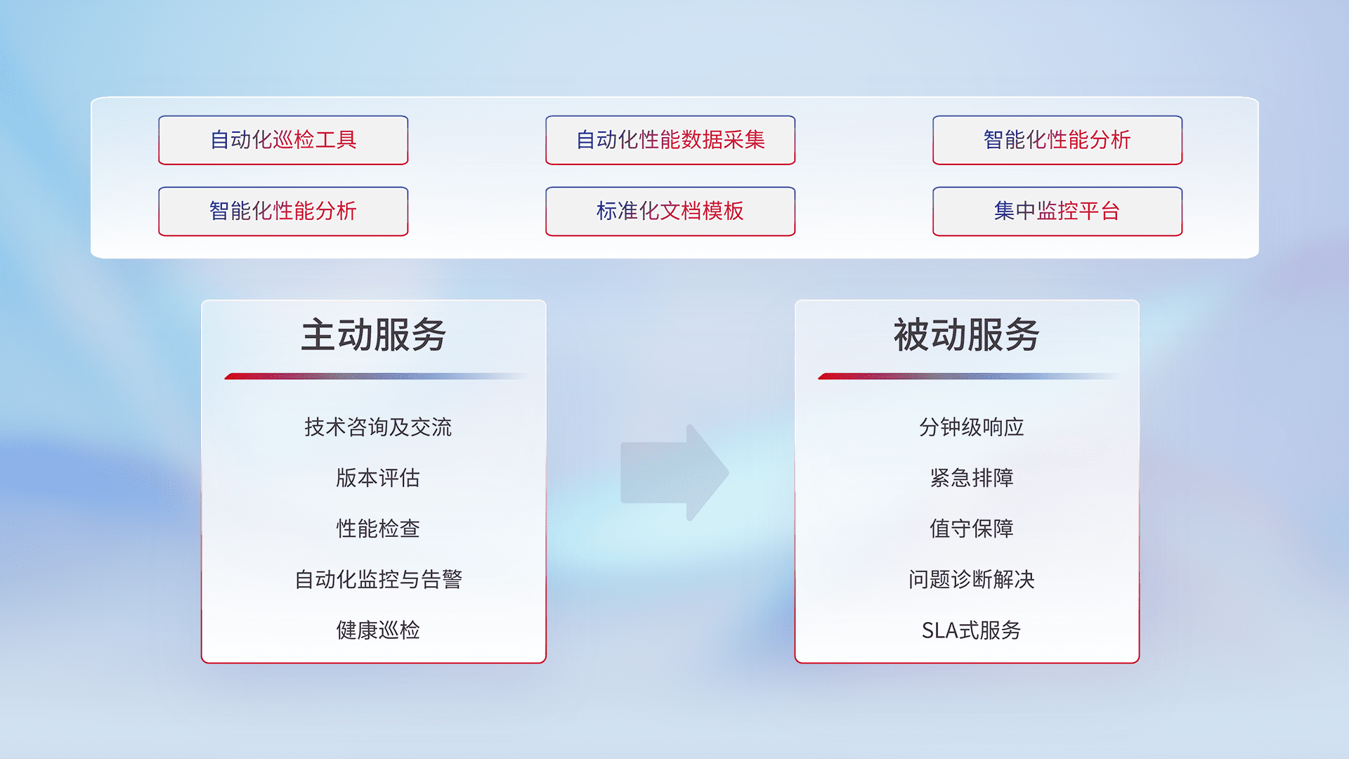 智能化工具和标准化文档,,,,保障服务质量,,,提供主动服务(包含技术咨询、、版本评估、、、、性能检查、、自动化监控与告警、、健康巡检)和被动服务包含(分钟级响应、、、紧急排障、、值守保障、、、问题诊断解决、、、、SLA服务)。。。
